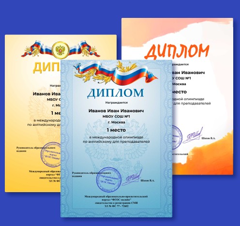 - Олимпиады по русскому языку для 1 класса- Олимпиады по русскому языку для 2 класса- Олимпиады по русскому языку для 3 класса- Олимпиады по русскому языку для 4 класса- Олимпиады по русскому языку для 5 класса- Олимпиады по русскому языку для 6 класса- Олимпиады по русскому языку для 7 класса- Олимпиады по русскому языку для 8 класса- Олимпиады по русскому языку для 9,10,11класса- Олимпиады по русскому языку для студентовПосле прохождения онлайн олимпиады вы сможете заказать именной диплом с оплатой на сайте.